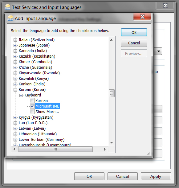 Scroll down to find Korean and check the box for Microsoft IME. Click OK.