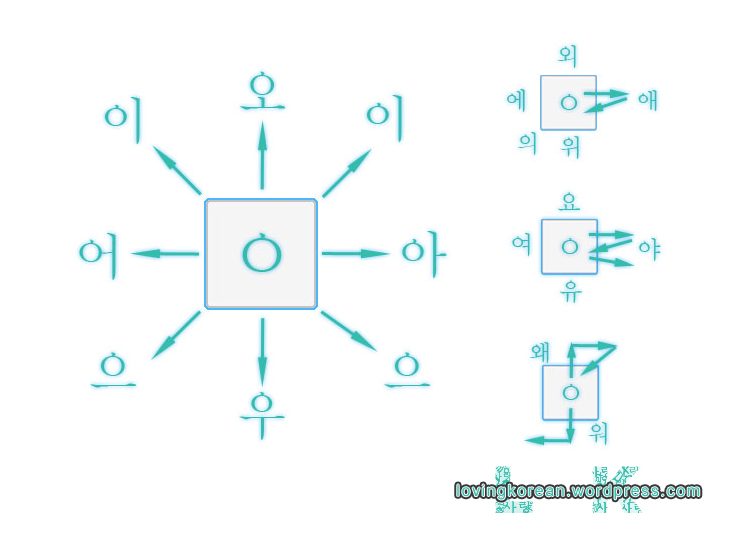 and thus convenient for phones. This particular Android touchscreen keyboard is called Moakey. It has a neat trick to use them. You might notice the vowels are missing on this one. You simply choose the consonant you wish to start the syllable with, and then swipe your finger in different directions to get different consonants. Here is a schematic for getting syllables that start with consonant ㅇ. You put your finger on the key you want and then without lifting your finger move it in the direction of the arrows to get the desired syllable. Click on the link above to see the video tutorial and further instructions.